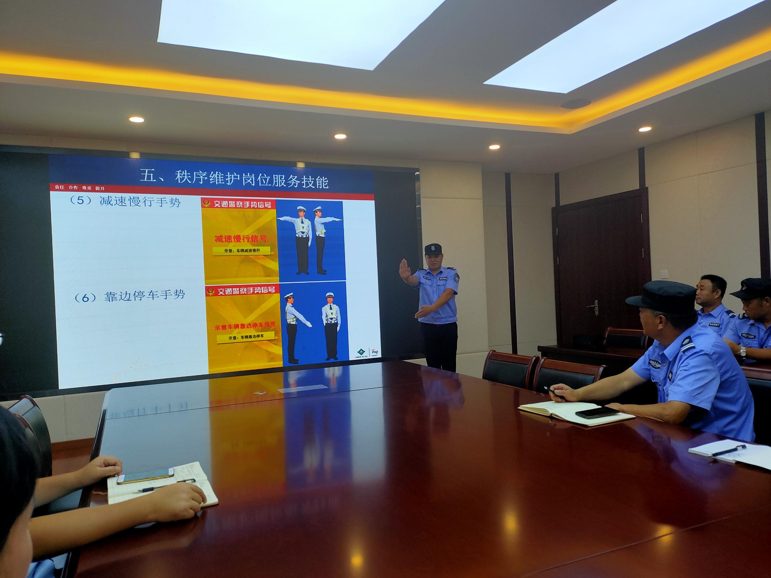 此次培訓(xùn)主要講解了道路交通法律法規(guī)、交通標識標線、交通事故認定知識以及如何正確文明行車。根據(jù)保安人員崗位職能特點,結(jié)合校園周邊交通現(xiàn)狀及交通陋習(xí)等方面,教授安保人員如何做好一名校園交通安全宣傳員、引導(dǎo)學(xué)校學(xué)生安全上下學(xué)、應(yīng)急處理校園周邊交通事故等。 隨后介紹了常用的交通指揮手勢,講解指揮手勢的動作要領(lǐng)及含義。
